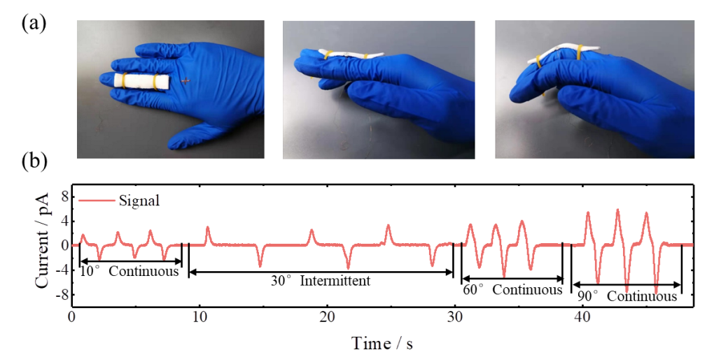 图3 多孔PDMS薄膜弯曲传感器:(a)不同弯曲角度和(b)相应的挠曲电信号输出