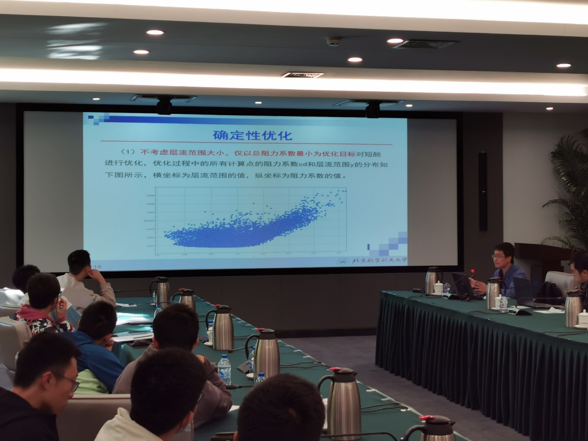 会上,宋磊为大家介绍了本次交流会的主旨,与大家分享了《飞翼布局飞机自稳定优化》的方法与思路。随后,杨穆清老师为大家带来了《短舱优化稳健性设计》研究报告。两位老师的报告在分享了内容的同时,也为同学们做了范本,为此次交流会迈出了重要的第一步。