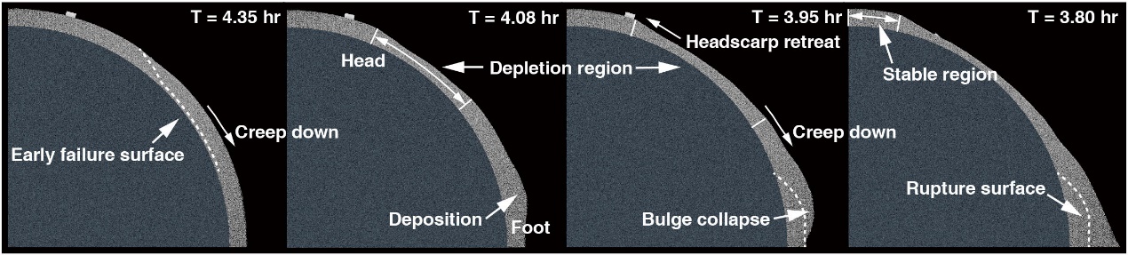 本文从这一地质特征入手,发现Yarkovsky–O'Keefe–Radzievskii–Paddack(YORP)效应可能是诸多小天体最终演化为陀螺型的幕后推手。课题组使用自主知识产权的小天体颗粒动力学软件DEMBody,建立了数百万颗粒精度的小天体地表模型,模拟了在YORP效应作用下,小天体在亿万年尺度上缓慢加速旋转的过程。结果表明,自旋加速所引起的离心力增大使得中纬度附近的颗粒层逐渐不稳定,最终滑移并沉积于赤道区域,形成鼓起的赤道脊;而在这一表面重塑过程中,地表巨石也随之蠕变移动,位于高纬度的巨石维持稳定,中纬度的巨石陷入下方的“流沙“中,赤道区域的巨石则被来自中纬度的沉积物完全掩埋。这一风化层-巨石耦合演化机制解释了陀螺型小天体的主要地质特征,显示了YORP效应在小天体地貌演变中的重要作用(图2)。