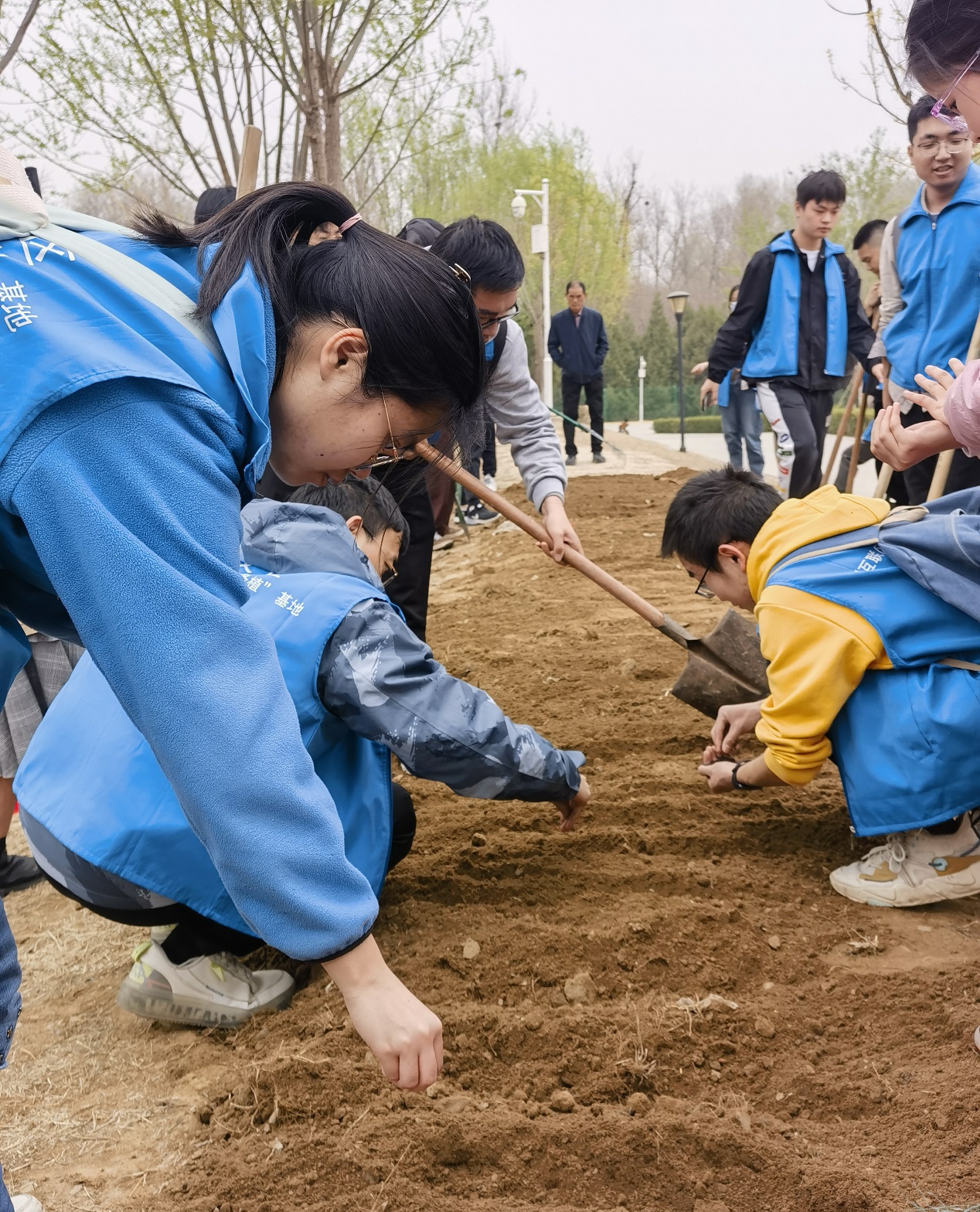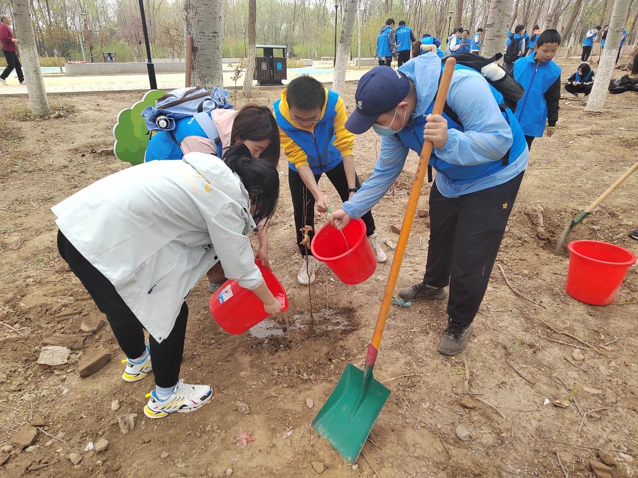 一行40余名学生在公园管理员老师的指导下,逐渐领会了“挖-翻-填-踩-浇”的种树育花技巧。同学们不顾飞扬的尘土,不嫌深埋的垃圾,不感劳作的疲惫,或扶铲来回于树坑,或携袋奔波于各处,或提桶浇筑于林地,汗水簌簌流淌,同学们没有丝毫的怨言,在一番辛勤劳作之下,一棵棵小树苗亭亭直立,一颗颗花种洒落大地,相信来年的春天,它们一定会为这片土地增添一份可喜的新绿与五彩的斑斓。植树育花的过程,也是育人成长的过程,“十年树木,百年树人”,航空学子也将如同新种的植株一般,向阳而生,迎风而行,彰显新时代青年昂扬的生命力量。
