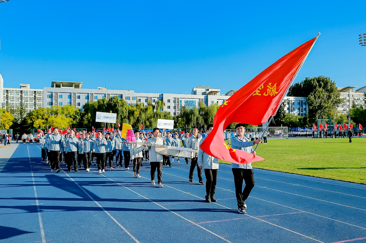 师生方阵在党委书记鲍蕊、工会主席高振勋的带领下,身着统一服装,热情挥舞着手中的红旗,踏着铿锵有力的步伐,昂首挺胸的姿态与“凌云争锋、创智空天、科教协同、航向未来”的口号展现出博彩导航