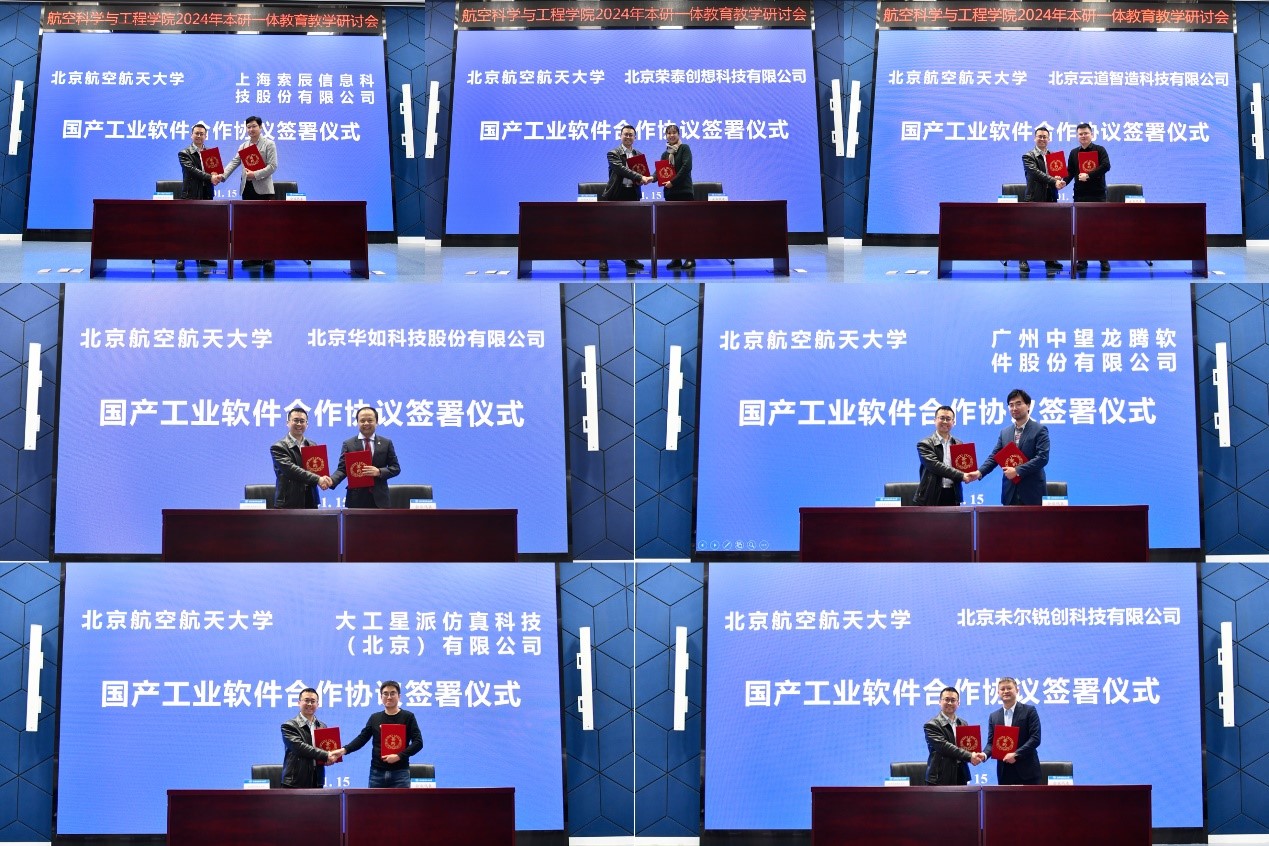 副院长罗明强与北京荣泰创想科技有限公司等7家企业单位代表签署国产工业软件合作协议,后续将依托“新一代全数字化飞行器科教协同创新中心”开展深度合作。