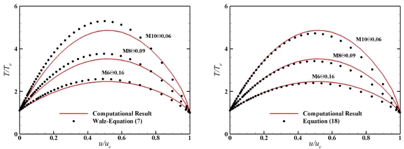 针对以上问题,研究团队首先在传统的Walz速度-温度关系式中引入了层流广义恢复因子rg,以综合考虑非单位普朗特数及壁面冷却等效应,并发现广义恢复因子rg在层流边界层法向维持不变,进而推导出相应的速度-温度关系式,其与精确结果的对比如下图所示。