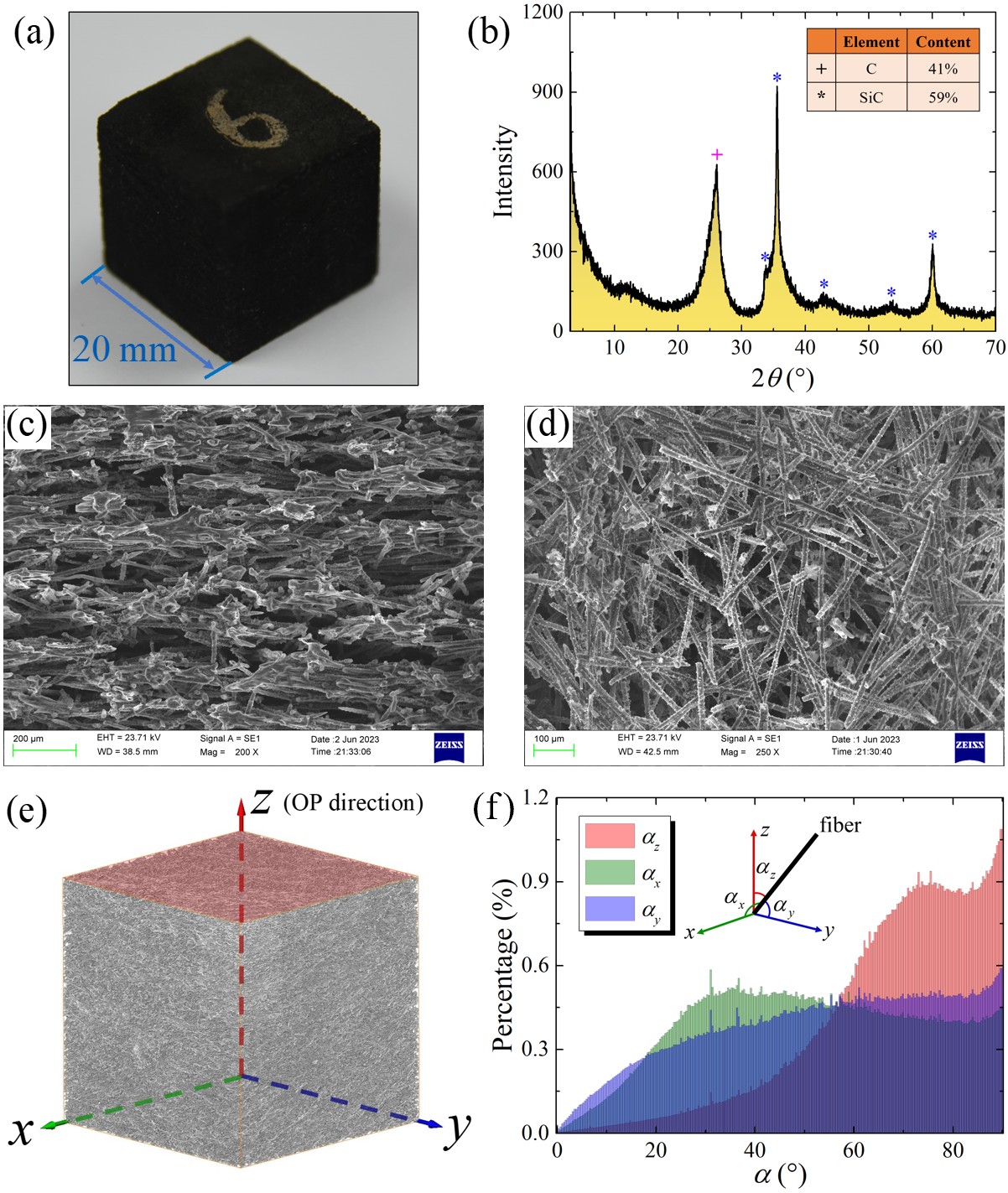 研究首先利用化学气相沉积方法制备了SiC-coated CBCFs材料,该方法能够有效减少多余涂层材料的堆积,并避免内部碳纤维与孔隙中残留氧气的反应。为了深入认识多尺度结构中微观结构与宏观性能之间的联系,利用电子扫描显微镜(Scanning electron microscopy, 简称SEM)和计算机断层扫描技术(Computed tomography, 简称CT)对其微观结构进行了详细的观测表征,结果显示SiC-coated CBCFs材料内部的纤维取向分布具有方向性差异,这也是造成其横观各向同性特征的内在原因。与未涂层的碳纤维表面对比,碳化硅涂层在碳纤维表面包裹均匀。引入涂层材料之后,粘接区域的体积增大,表明碳化硅与热解碳相互结合,共同参与交联纤维之间的粘接行为。