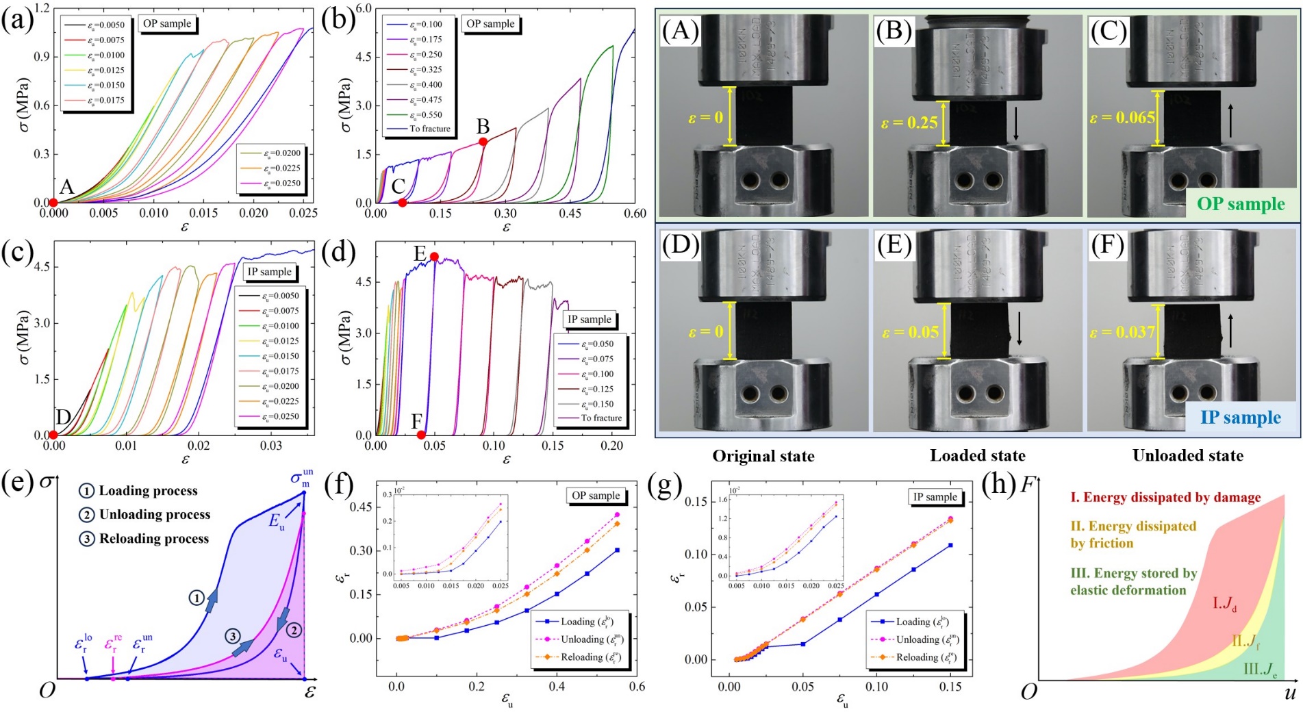 为评估SiC-coated CBCFs材料力学性能的退化规律,研究设计了三组准静态循环压缩实验,包括单次逐级循环压缩实验,200次单级循环压缩实验以及25次逐级循环压缩实验。研究发现面外循环压缩的应力-应变曲线表现出明显的滞回环,在后续加载中存在应力软化现象,而面内压缩条件下样品的卸载曲线则与加载曲线斜率相近。SiC-coated CBCFs材料在面外方向上具有明显的压缩变形可恢复特征,结合材料内部微观结构的变形与能量的关联,研究人员深入分析了材料内部的损伤机制。