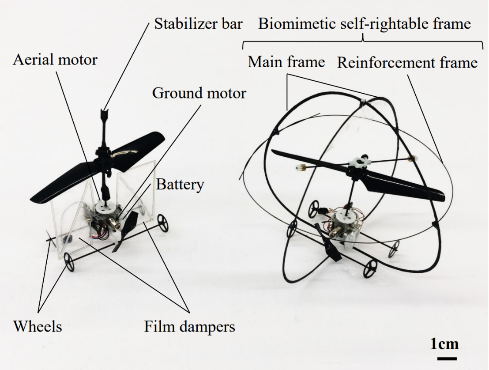 此外,该飞行器通过额外携带一个重0.37g仿生外壳,在地面模式下具备自扶正的能力。通过实验验证,飞行器携带仿生外壳后实现了223秒的稳定飞行,能够在多种地形条件下完成地面自扶正,成功实现了空地两种模式的稳定转换。