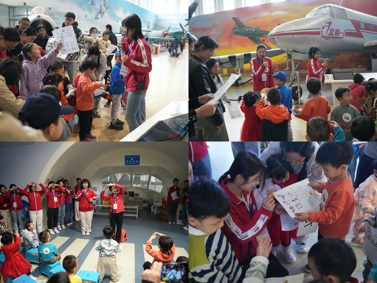 教职工子女在博物馆内进行寻宝打卡、静电小实验、镜面反射体验等活动,将晦涩难懂的空天知识转化为幼儿可理解、操作的小游戏,激发幼儿对空天科学探索的热情。