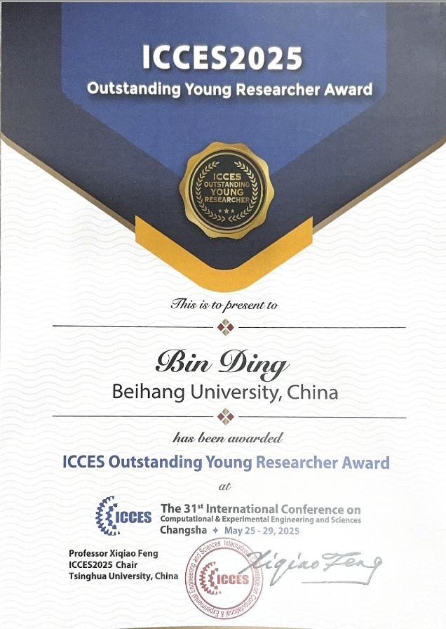 丁彬副教授凭借其在微纳米力学与能源材料力学领域的突出贡献,被授予“ICCES Outstanding Young Researcher Award”(ICCES杰出青年学者奖)。