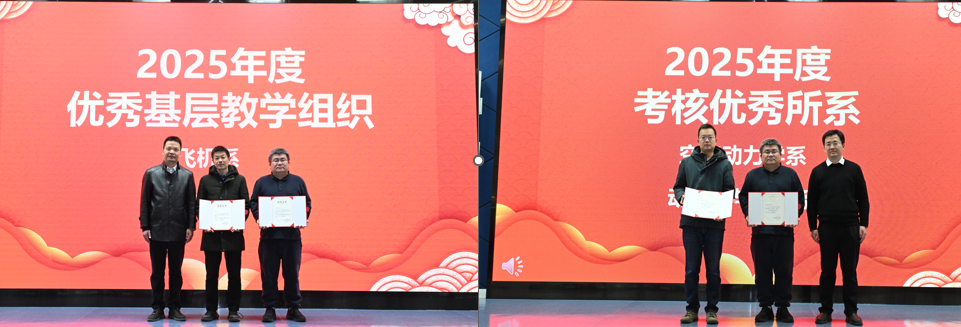 2025 年度教育教学表彰仪式,对课程与教材建设、教学改革、教学成果、教师发展及优秀教学组织等方面表现突出的集体与个人予以表彰。教务部部长钱政为飞机系、空气动力学系颁发 “优秀基层教学组织” 证书;博彩导航