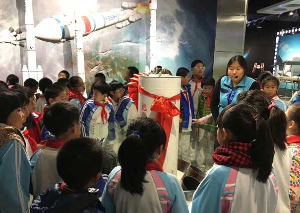 随后,同学们来到了二楼展区,穿过“空天走廊”,孩子们见识了航空与航天从无到有的演变,小小的一段走廊像一部长长的纪录片,向孩子们展示了航空航天发展史的一个个里程碑。在“神州问天”展区,讲解员给孩子们介绍了神舟系列飞船,还向他们展示了馆内的一件宇航服仿品,观看了神舟飞船的发射过程动画,充满科幻色彩的太空实验基地效果让孩子们惊叹,感觉真像是在遨游太空。