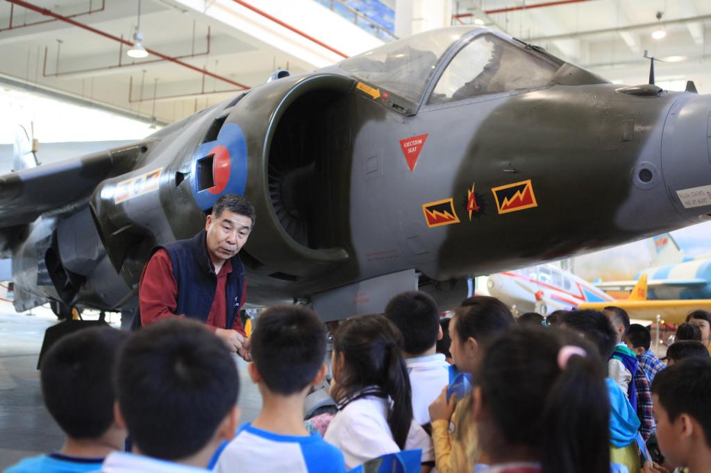 人,在短短的100天内,自己设计制造的一架轻型旅客机,它从北京飞到了上海、南京。作为一架飞机,它主要由机身、机翼、发动机、起落架、机载设备等几部分组成。而在鹞式战斗机前,韩老师亲自示范,让孩子们看到了这架飞机的特殊性:它的喷气口在腰部,而且可以转动,能够向下喷气,也正因为此,它可以实现垂直起降的功能。