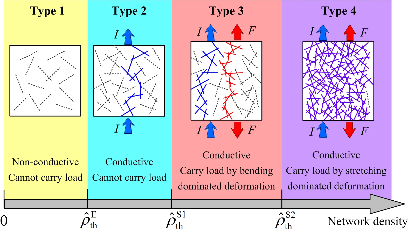 图1 碳纳米管网络可根据其力电性能分为四类:(1)不导电且无法传递载荷、(2)导电但无法传递载荷、(3)导电且可以勉强传递载荷、(4)导电且可以有效传递载荷。三个分界点依次为:导电阈值、刚度阈值、弯-拉转变阈值。