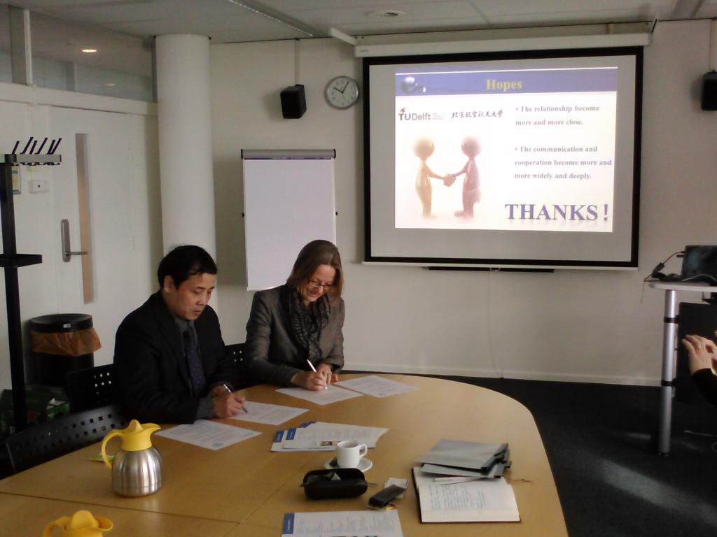 在荷兰TU Delft Faculty of Aerospace Engineering,荷方院长Bijl教授与我方代表团团长、博彩导航