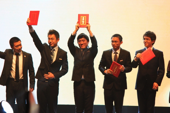 2010级本科生蒋晓航(中)作为《第三创益人力资源有限公司》项目获奖代表上台领奖