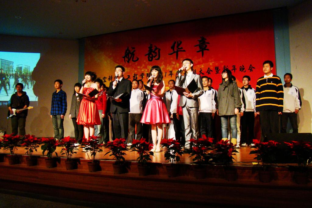 随后进行了主题为“航韵华章”的新年晚会。晚会以100516班颇具航空特色的舞蹈《飞》开场,共分为美丽新世界、携手风雨路、共绘蓝天梦三个篇章。晚会节目形式多样,涵盖歌曲、舞蹈、乐器、朗诵、武术、魔术、话剧等多种表现形式。晚会以校园生活为主线,形式丰富多彩,内容积极向上,博得了现场观众的阵阵掌声和如潮好评。为增加与观众的互动性,晚会还设立了现场抽奖和人人墙互动环节,使每一位在场观众和演员都能积极的互动起来,为晚会的气氛着色不少。