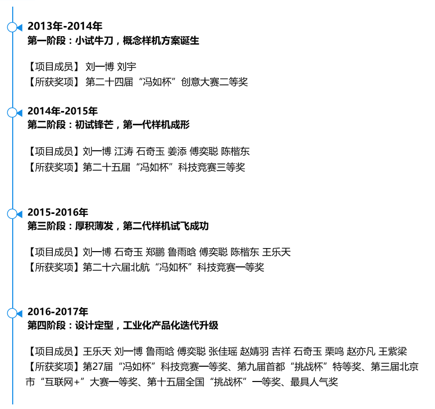 的“新概念共轴倾转旋翼机”研发团队,经历四年累进创新,经历了概念提出、样机试飞、控制优化升级、产品生产定型等几个阶段,最终形成了一套成熟稳定的小型倾转旋翼机整体解决方案完成了一款小型倾转旋翼机的开发,斩获冯如杯科技竞赛一等奖、冯如杯创业大赛金奖、北京市互联网加一等奖、首都挑战杯特等奖、全国挑战杯一等奖等重要奖项。