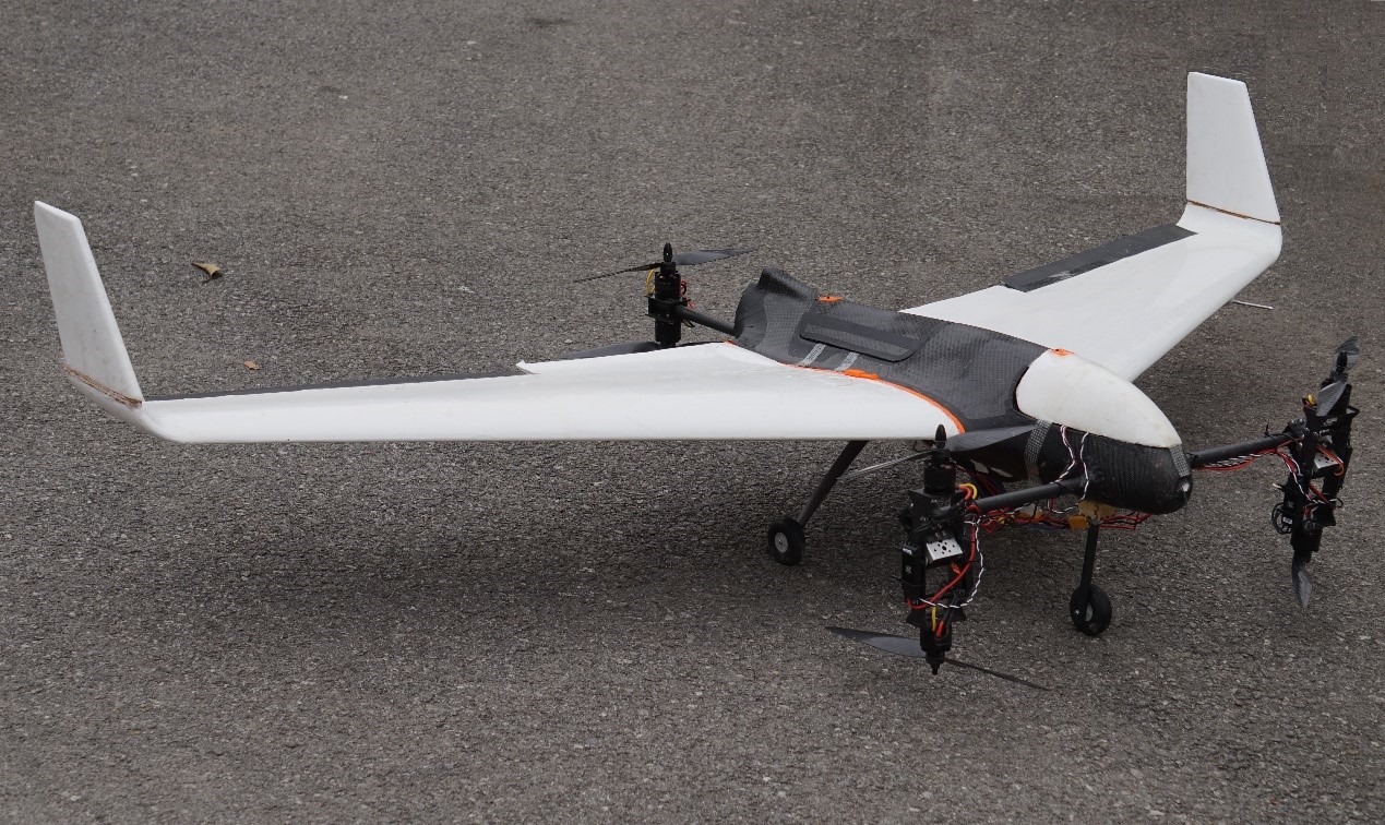 飞行力学与安全系的关键技术支持,同时获得了大学生创新创业训练基金1万元人民币额度的支持。在飞行力学实验室的基于RASS系统的硬件在回仿真设备的支持下,项目成员对过渡控制方法进行了全面升级,放弃了前拉电机,采用伺服控制机构来实现垂直电机的转向,并放弃了两轴式布局,改为稳定性,安全性更高的三轴六桨式设计。在为期一年半的控制律研发,团队提出了一种以空速作为转换判据的倾转控制程序和旋翼差速与气动舵面耦合的全新抗风增稳算法。
