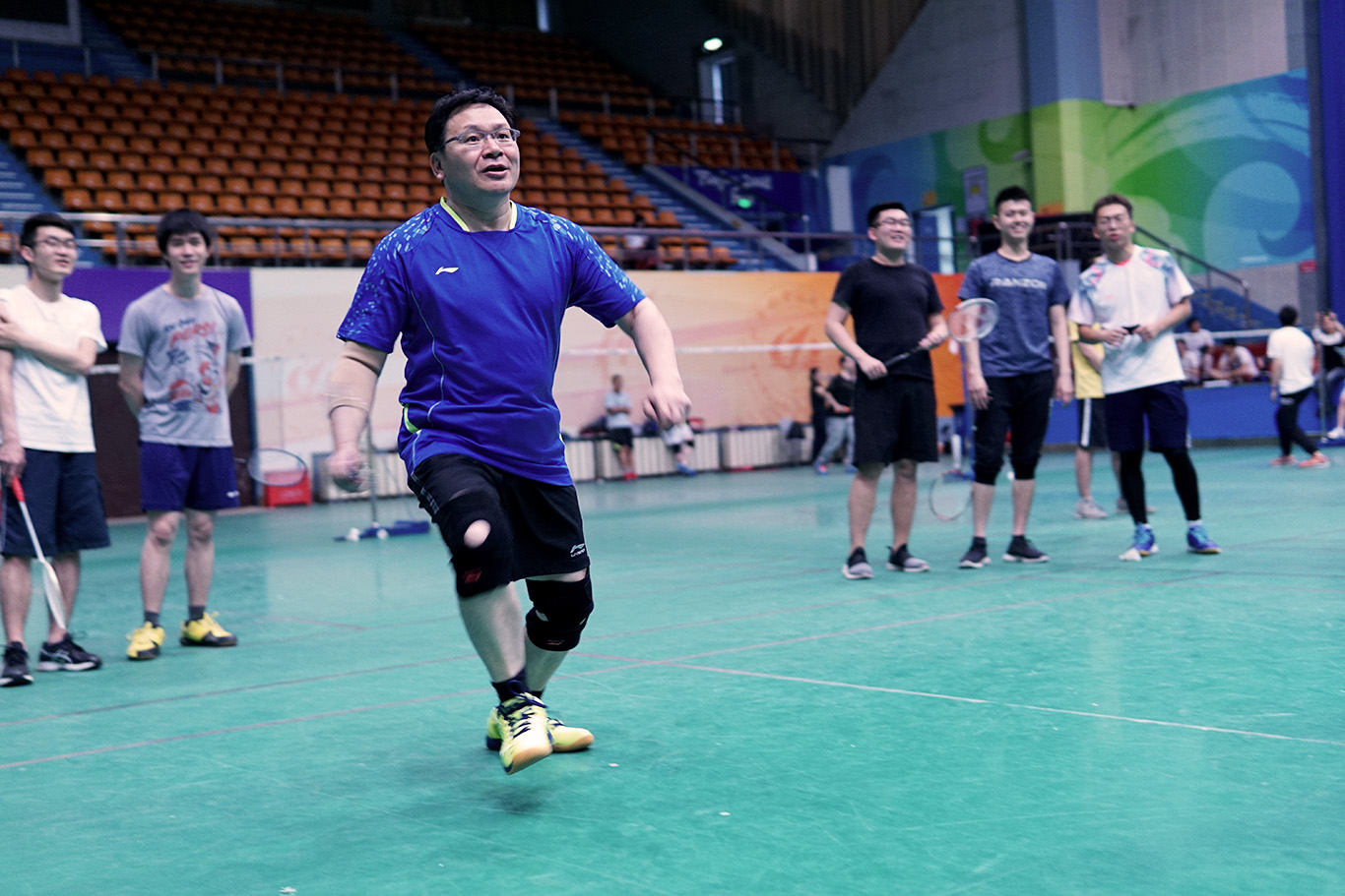 8点20分,小组赛拉开帷幕,所有参赛队伍分为A、B、C、D四个小组,组内进行单循环赛,小组的前两名将获得出线机会。比赛中每支队伍都顽强拼搏,挑战自我,赢得了场边观众的阵阵喝彩。男双的比赛异常激烈,双方队员热情高涨,斗志昂扬。混双的比赛更加精彩,女队员的网前截杀,男队员的后场吊球,吸引了大批的观众前来观战。看着场上的比赛选手腾挪跳跃、身姿飒爽,坐在场边等待的选手和围观的羽毛球爱好者们也都跃跃欲试、纷纷在练习场地上一展身手。
