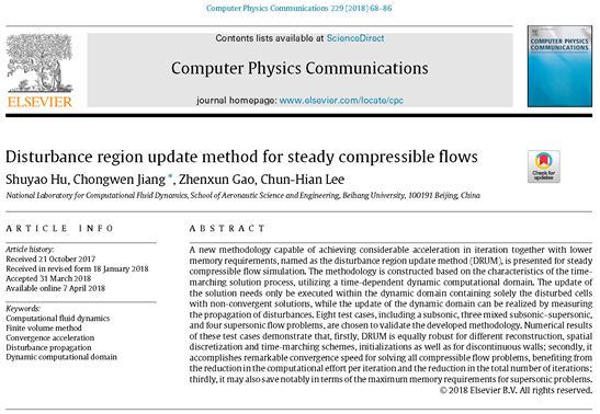 李椿萱院士团队的博士生胡姝瑶和蒋崇文副教授、高振勋副教授在物理数学领域排名第一的国际顶级期刊《Computer Physics Communications》上发表题为《Disturbance region update method for steady compressible flows》的学术论文。该文章是博彩导航