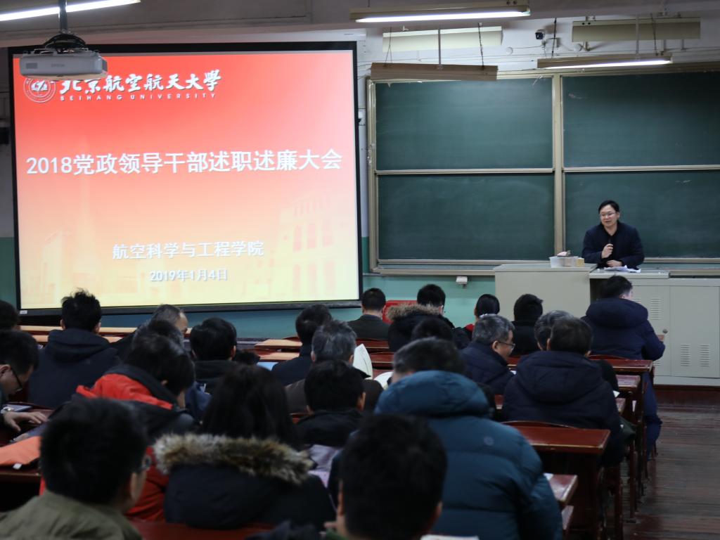 2018年度党政领导干部述职述廉大会在一号教学楼201教室召开,全院教职工100余人参加会议,会议由党委书记林贵平主持。