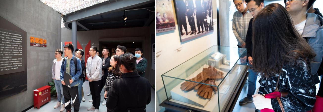 随后,在纪念馆孙瑶副主任的带领下,辅导员团队集体参观了纪念馆的三号展馆,在这里听孙主任讲述中外航空烈士可歌可泣的抗战历史。八年抗战,共有一千多位中国空军将士牺牲,这其中包括被称为中国“空军战神”的高志航;“空中红武士”刘粹刚;击落过8架日机,有“空中飞将军”之称的乐以琴;用行动践行空军誓言——“我们的身体、飞机和炸弹当与敌人的兵舰、阵地同归于尽”,用飞机撞向敌舰的沈崇诲烈士。中国空军先后参加松沪抗战、南京保卫战、武汉空战,支援南昌、徐州作战,保卫重庆,轰炸台湾松山机场等多次战役、战斗,击落、炸毁日军飞机1500多架。其间穿插着一些闻名中外的航空抗战故事,包括百万传单“人道轰炸东京”、驼峰空运等。“国际援华”部分集中展示苏联航空志愿队、美国飞虎队、美中特混航空队、驼峰航线等世界正义人士和援华人员,为空中对日作战和中国抗战胜利付出的牺牲和做出的卓越贡献。
