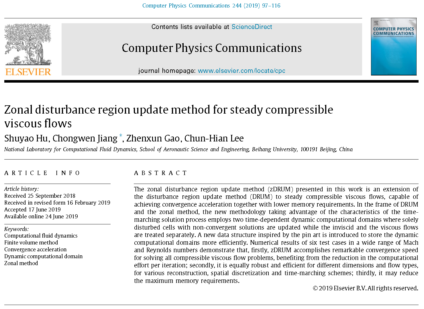 李椿萱院士团队博士生胡姝瑶在蒋崇文副教授、高振勋副教授指导下在物理数学领域国际顶级期刊《Computer PhysicsCommunications》上发表题为《Zonal disturbanceregion update method for steady compressible viscous flows》的学术论文,这是该团队在扰动域更新法研究方向的又一篇学术论文。去年,该团队提出了扰动域更新法并发表了博彩导航