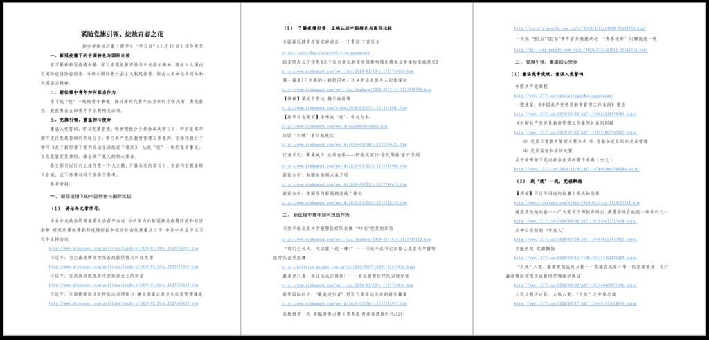 提前策划布局,制定发布第5周学习日指导意见,凝练多个主题,并提供详实贴切的参考资料,各研究生当支部、本科生班级围绕大国担当、青年使命、党员初心等多个主题,站在国家、青年、党员多个维度,通过邀请宣讲团、主题微党课、大班会、小班会等多种形式集中学习,并采取小组讨论、感想交流等形式进行理性思考,深化学习效果。同学们学讲话、讲事迹、观大局、话担当,深刻领会全民战“疫”凸显的中国特色社会主义制度优势,热烈探讨青年学生如何树立远大理想、练就过硬本领、牢记使命担当,思考怎样不惧风雨、勇挑重担,让青春在党和人民最需要的地方绽放绚丽之花。