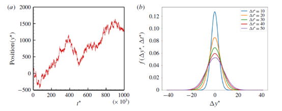图2 (a)模拟分子的运动轨迹;(b)随时间变化的分子位移的概率密度函数。