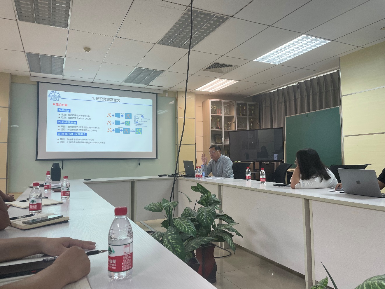 仲政教授系统介绍了基于非平衡态热力学的力化学耦合连续介质理论,通过引入反应进度和扩散浓度两组变量来描述化学反应和物质扩散在不同时空尺度下对材料响应的影响,结合具体案例介绍该理论在各种耦合情况下的应用。与会师生针对该学术报告提出的多场耦合理论中的诸多重要问题进行了热烈的讨论。