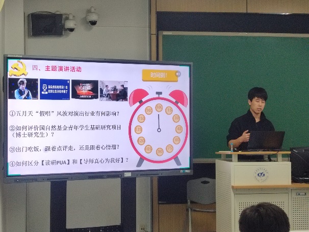 随后,支部开展了特色交流活动——三分钟主题演讲。杨泽鹏、杜春晖、王培振和安博洋四位同志分别就本期话题分享了自己的观点,与支部同志进行热烈探讨。针对假唱风波,杨泽鹏同志提出文艺工作者应保持职业素养,尊重粉丝尊重艺术;针对导学关系,大家讨论认为要明确个人的专业兴趣和能力水平,认真合理地听取导师意见,认为建立稳定的自我价值内核和保证身心健康十分重要且必要。