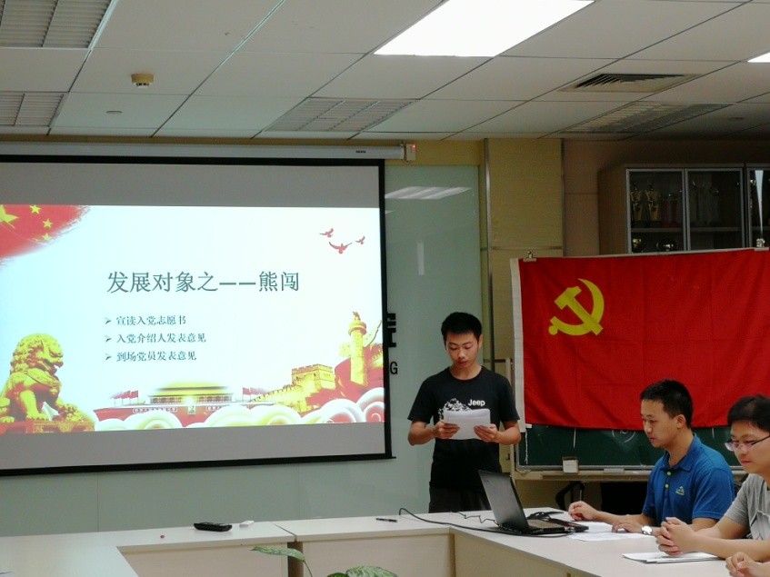 硕士17054党支部召开了预备党员发展大会。会议首先由熊闯、王子瑜和于川三位重点发展对象宣读自己的入党志愿书,他们对自己的定位清晰,入党动机明确并且经过了深刻的思考,也付出了让支部认可的行动。