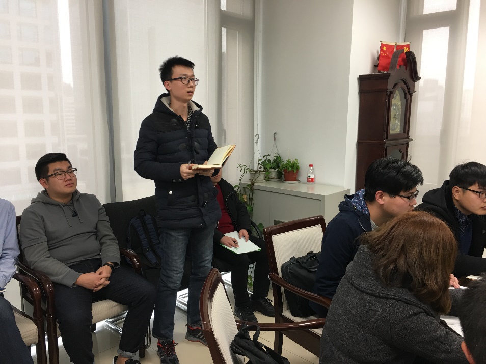 会议第三项,由几位党员同志为大家分享参加党员集中学习后的一些心得体会。其中,聂榕序同志针对辛向阳院长提到的“中等收入陷阱”阐述了自己的理解,成昌福同志讲述了自己对“四个伟大”意义的理解以及对与树立正确三观的理解,徐连超同志则表示自己从集中学习中认识到了伟大斗争的重要精神,并号召大家要勇于面对挑战和困难。吕甘霖同志则提到了对于中国梦的诠释,为大家解释了自己对于“中国梦是过去的,现在的,也是未来的”的理解。