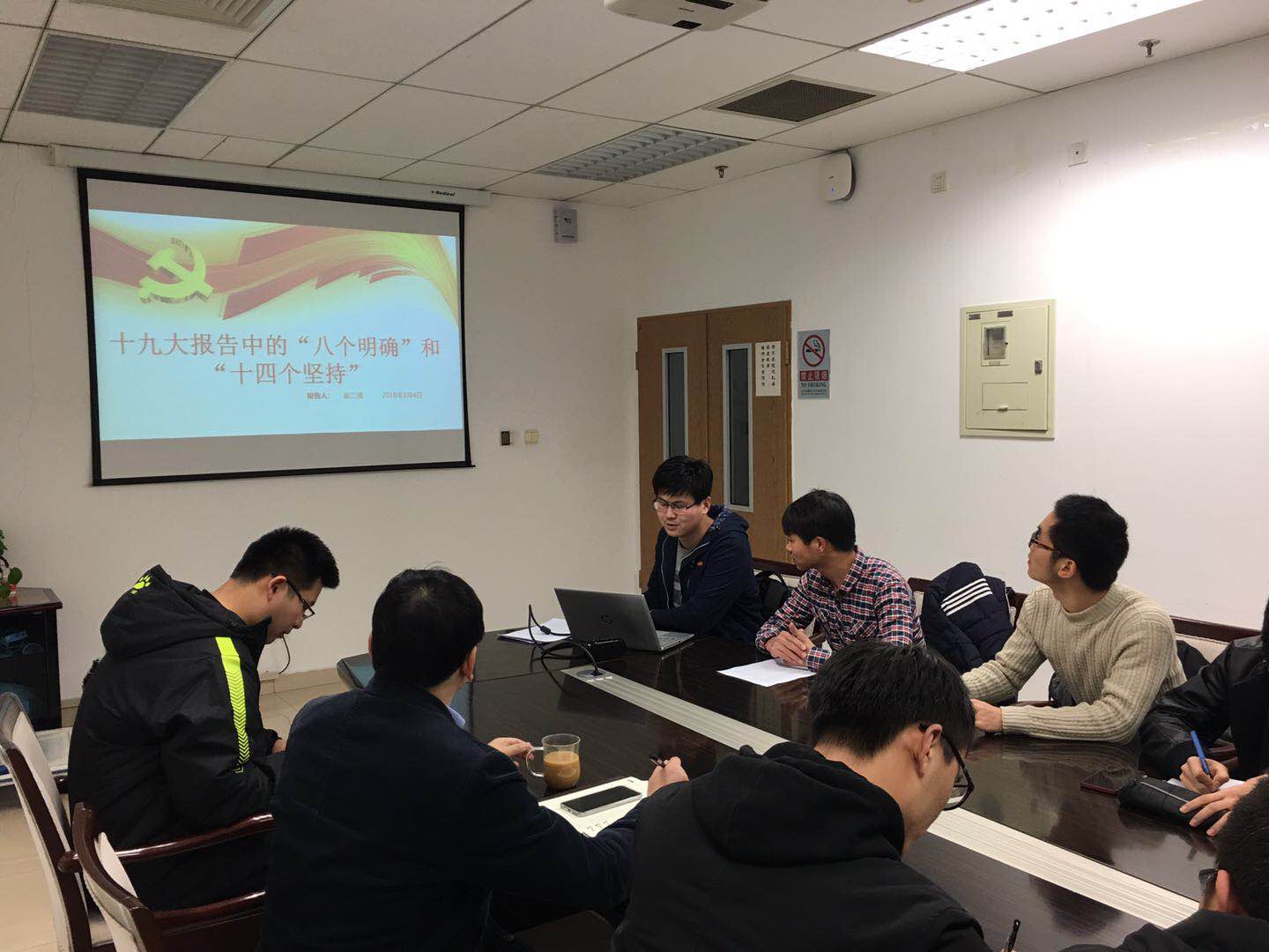 本次会议的主要内容为专题组织生活会及民主评议党员、党员分享学习体会、党支部2018年度工作计划及林书记讲话等。会议在嘹亮的国际歌声中开始,随后崔二强和王凯钥同志为大家分别做了题为《十九大中的“八个明确”和“十四个坚持”》和《深入学习党章,做合格党员》的报告。崔二强同志为大家阐释了习近平总书记在十九大报告中提出的“八个明确”和“十四个坚持”的深刻含义。而王凯钥同志则阐释了党章中规定的党员八项义务,解释了习近平新时代中国特色社会主义思想和遵守政治纪律和政治规矩的五个方面的要求,以及我们基层党组织的基本任务等。