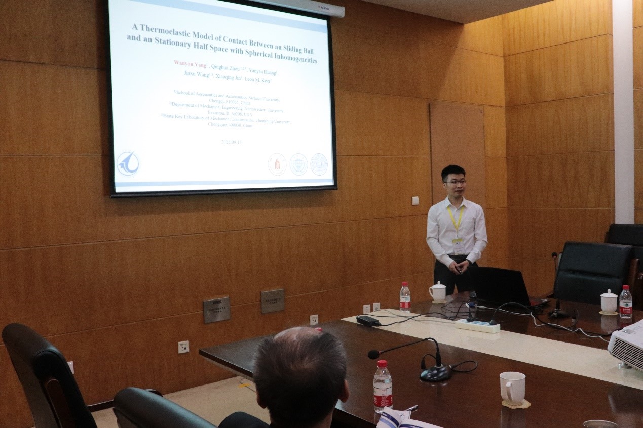 WanyouYang的报告题目是《A thermoelastic contact model between asliding ball and a stationary half space distributed with spherical inhomogeneities》。