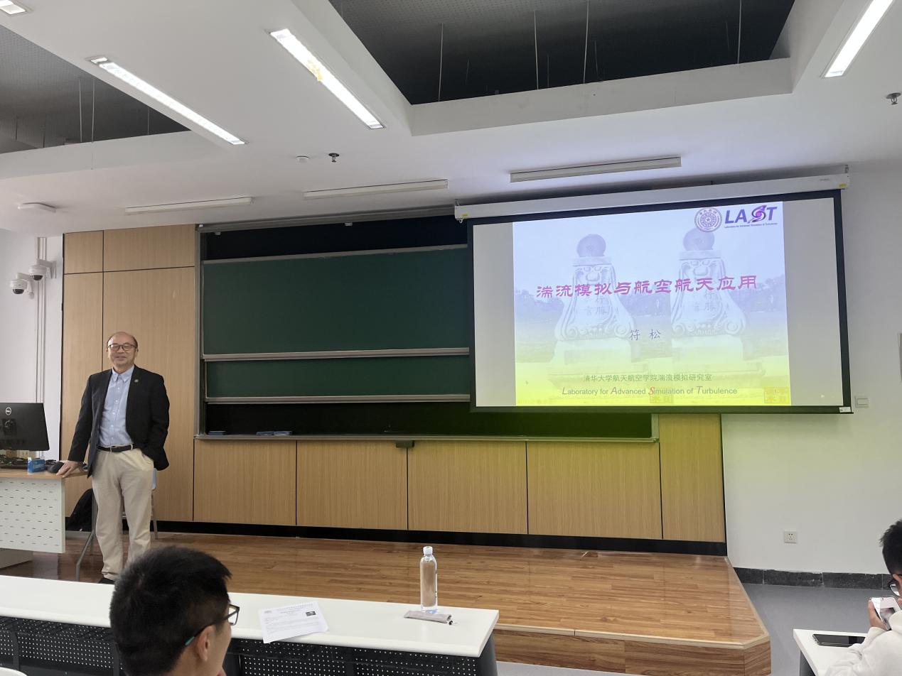 符松教授讲述了湍流模拟的主要方法及进展,重点介绍了涡粘性模式的特点以及该模式不满足可实现性条件等缺陷。针对该问题,符松教授通过向涡粘性模式中引入非线性项构造了非线性涡粘性湍流模式,其中的显示代数应力模式满足了可实现性原理,相比于传统的线性涡粘性湍流模式能更好地反应曲率对湍流的影响。此外,符松教授还简要介绍了RANS/LES混合方法的基本原理,以及该方法在高速复杂流动模拟等方面的最新研究进展。与会师生针对报告内容与符松教授进行了热烈讨论。