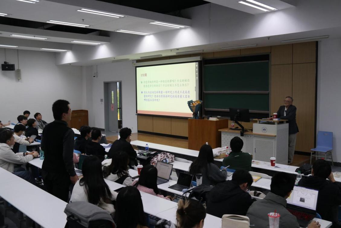 最后,余同希教授与现场师生进行了互动,讨论了什么时候会觉得做科研是一件快乐的事、以及怎么衡量一项研究工作是不是高质量的研究、如何保持研究的高质量等,启发大家思考后又进行了进一步的解答,鼓励大家持续学习、增强内功,并用更多的时间专注思考问题。