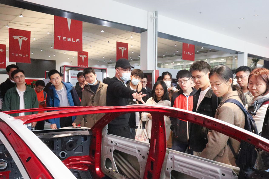 科技的进步,给社会生产带来了全新的机遇,让行业拥有了创新的力量。在活动期间,同学们参观了特斯拉的模拟冲压展示车间,通过近距离的观察汽车框架结构,让同学们更加熟悉了将金属材料变成外观零件的全过程。薄薄的一块钢板,却能承载着巨大的载荷;高精度的加工设计,让各部位更加紧密结合;自动化的加工流程,让生产效率大幅提升。同学们在参观中积极与老师积极互动,在学习先进设计理念的同时,也收获了许多心得体会,受益匪浅。