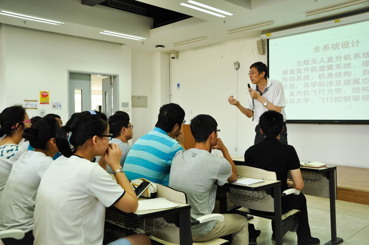 轻型飞机研究设计室讲起,告诉同学们2002年才正式开设的直升机课程后续发展取得的成就。之后陈铭教授针对直升机研究所的教学理念和设计经验,向大家展示了富有特色的现场教学,全国一流的实验设备等等,让同学们大开眼界。
