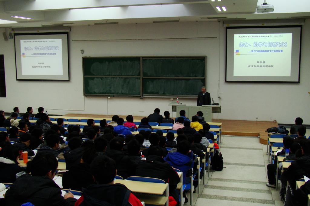 邓教授结合同学们的实际情况,深入浅出,分别从修身、治学和创新三个方面步步深入地谈理想、谈学术、谈科研,从自己的现实经历出发,通过丰富的专业知识,详细谈了关于航空器的自由摇滚运动的研究,给同学们展开讲述了课本上学不到的航空知识与科研成果。教授的平易近人、谦逊祥和与幽默风趣给同学们留下了深刻的印象。尽管年已古稀,邓教授依然用他的热情、风趣和渊博的学识与经历使整个讲座轻松而又意蕴无穷。