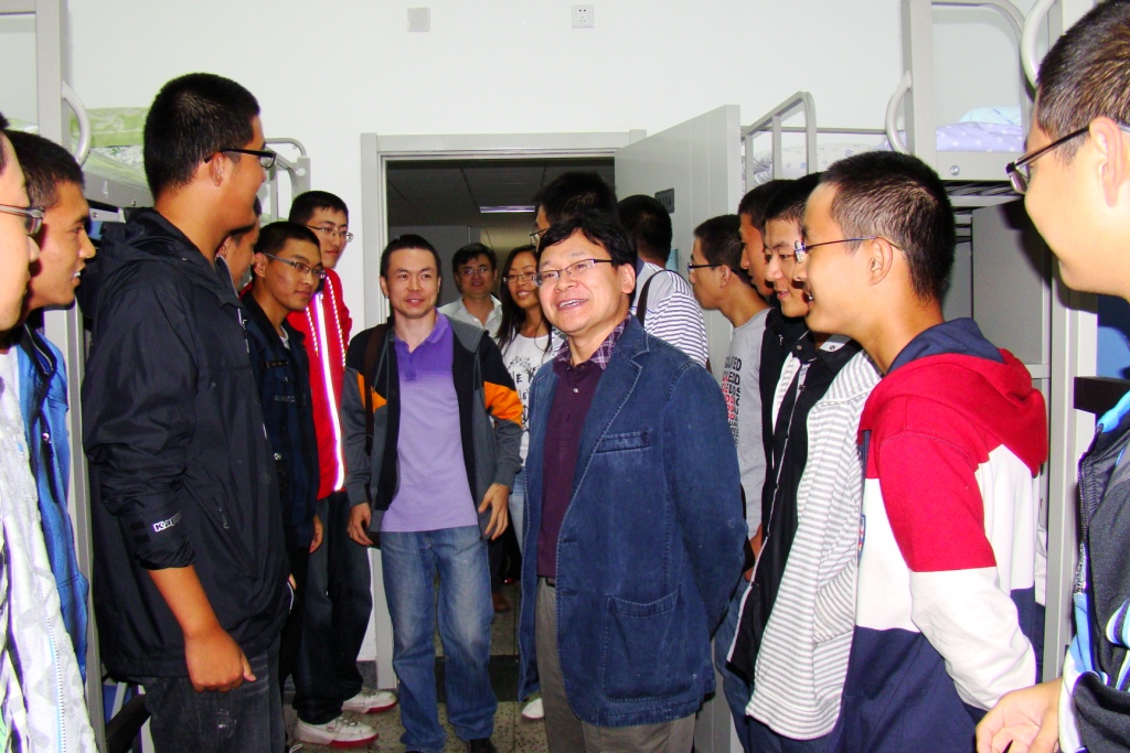 领导和老师们依次慰问了11班至19班的学生宿舍。在宿舍里,林书记受到了同学们的热烈欢迎。林书记首先给大家带来了中秋的祝福,同学们向林书记报以热烈的掌声。随后,林书记亲切地和同学们交谈,询问之前军训的情况,现在的住宿条件和第一次出门在外、远离家乡的感受。同学们纷纷表示,对现有的住宿条件十分满意。在得知沙河新校区的宿舍每个人都能使用宽带以后,林书记高兴地说:“现在条件好了,大家可以用更多的手段同家里联系,给家里人报个平安。”同时也叮嘱同学们:“千万不要沉迷于游戏耽误了学习!”之后,书记又与大家谈论了今后的课程设置、大家的学习规划等问题,整个过程充满了欢声笑语。
