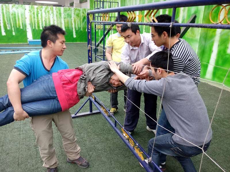 6. 穿越电网。一个团队站在一个蜘蛛网绳的一面,通过数量有限、大小不一的网口,在不能触网的规则下,通过网口将团队所有人员输送到网的另一面。