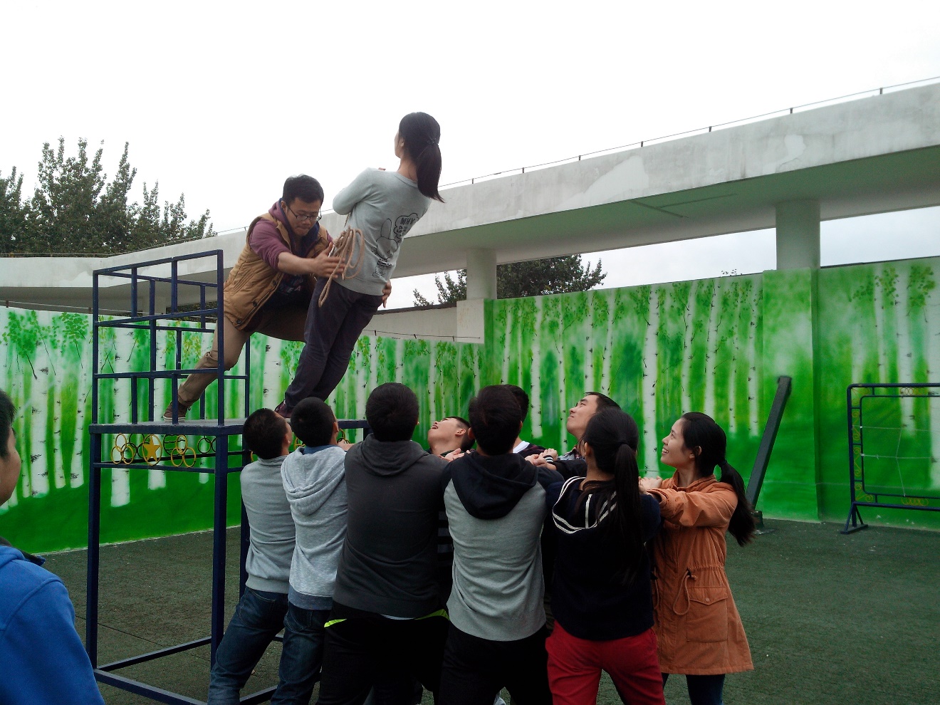 此后开始了正式的环节,进行的内容是信任背摔以及“穿越电网”。在这信任背摔活动中,难点就在于倒下的队员需要克服本能与恐惧,充分信任队友,将自己的躯干挺直,才能完美下落。在这一过程中,我们营造了一个充满信任的环境,建立换位思考的意识,通过身体接触、实现情感的沟通,信任与责任的建立。此次活动大大加大了班级凝聚力,同时使班级同学更有活力,同学间感情大大加深。