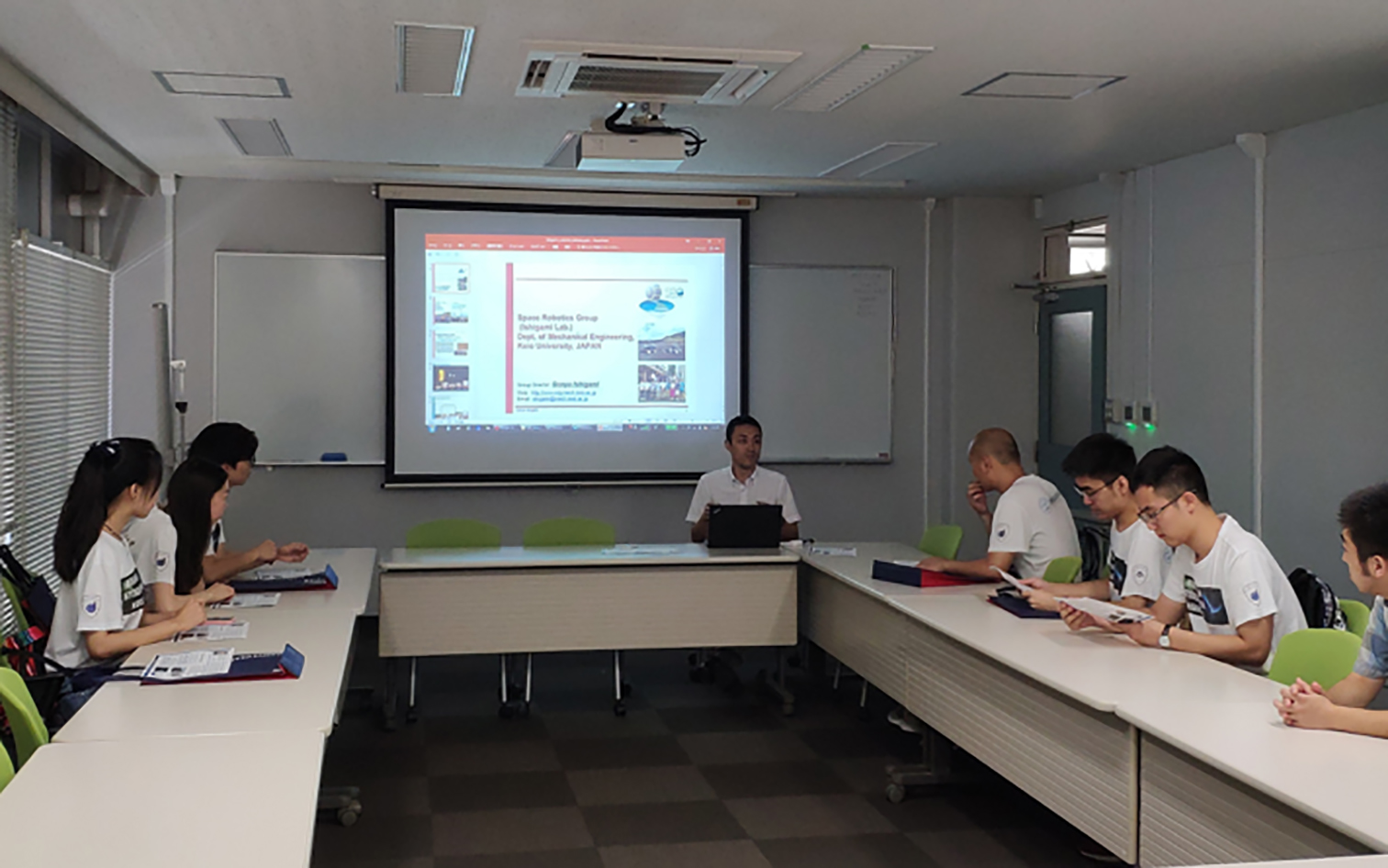 交流的第二站是机器人实验室,该实验室的CENYA ISHIGAMI 教授向我们介绍了他们实验室的研究方向与成果。该实验室对机器人的移动系统进行基础研究和应用研究,目的是应用于行星探测车的和领域机器人的开发。其中基础研究的主要内容如下: