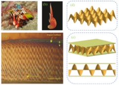 空天飞行器存在高速碰撞、冲击毁伤和防护问题,最具挑战性而又急需解决的难题是涉及应变率在105/秒量级以上的高速冲击条件下材料和结构的动态能量吸收。因此,如何选用新颖结构模式及组成的轻质、强韧、抗冲击多功能一体化结构,以使整个结构在保持较高的强度及刚度的同时大幅降低结构重量,提高空天飞行器结构的抗冲击防护性能,是未来先进飞行器结构设计技术急需解决的重要问题。自然界生物在经过亿万年优胜劣汰的进化过程中,为了生存、竞争和发展等各种需求,优化出许多具备优异力学性能的结构。本团队成员从仿生工程技术的概念出发,利用雀尾螳螂虾的双向人字形模式冲击区可以设计出抗冲击能力更强的双曲波纹仿生夹芯结构(图1)。研究结果表明:基于雀尾螳螂虾前肢特殊的曲面结构大大提高了传统夹芯板的抗冲击能力。此外,蜂窝材料是人类研究向自然学习的典型成果,其灵感源自蜜蜂的天然六边形蜂窝。由于蜂窝结构连续的多墙面排列和六边形网状结构分散承担来自各方向的外力,导致对挤压变形的抵抗力强于其它形状的结构。受超强韧性的柔性电子技术的启发提出了一种马蹄形蜂窝芯层结构。将传统蜂窝单胞的直边沿横截面方向替换为马蹄状的曲边构造成为马蹄形波纹蜂窝结构,提高了芯层结构的平台力以及能量吸收能力。此外,为了提高蜂窝结构的比吸能同时又减少初始峰值载荷,又提出了一种轴向波纹蜂窝结构,大大改善了传统蜂窝结构的力学性能。以上基于仿生原理设计并制备的轻质、强韧、抗冲击多功能一体化结构作为空天飞行器的主要承载结构,大大提高了空天飞行器在承受极端载荷条件下的生存力。