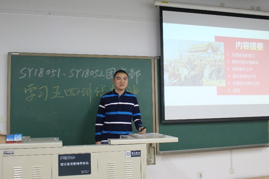张博文同志讲解结束后,与会同学们展开了积极讨论与分享。SY18052团支部的谢冉同学认为,“每个时代的青年人有不同的时代任务。对于五四运动时期来说,青年人的主要任务是救国,而现在青年的主要任务是图强,青年人要为强国梦而奋斗,把自己的本职工作做好。”SY18052团支部的李子晗同学则针对青年们的实际行动讲述了自己的观点,“作为新时代的青年,我们更多的时候要好好考虑可以做什么来实现自我的价值,能够为实现中华民族伟大复兴贡献自己的力量。”