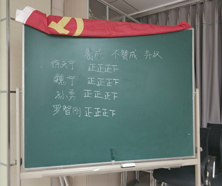 会议的第二部分内容为讨论徐天宁等四位同志按期转正。四位预备党员依次朗读转正申请书,汇报了自己在预备期间中的表现,总结了在思想上、生活上、工作上、学习上的进步,最后表达了自己加入中国共产党的坚定决心。同时入党介绍人及与会党员也对申请转正的预备党员发表了意见。通过无记名投票,徐天宁等四位预备党员均正式转为中国共产党员。
