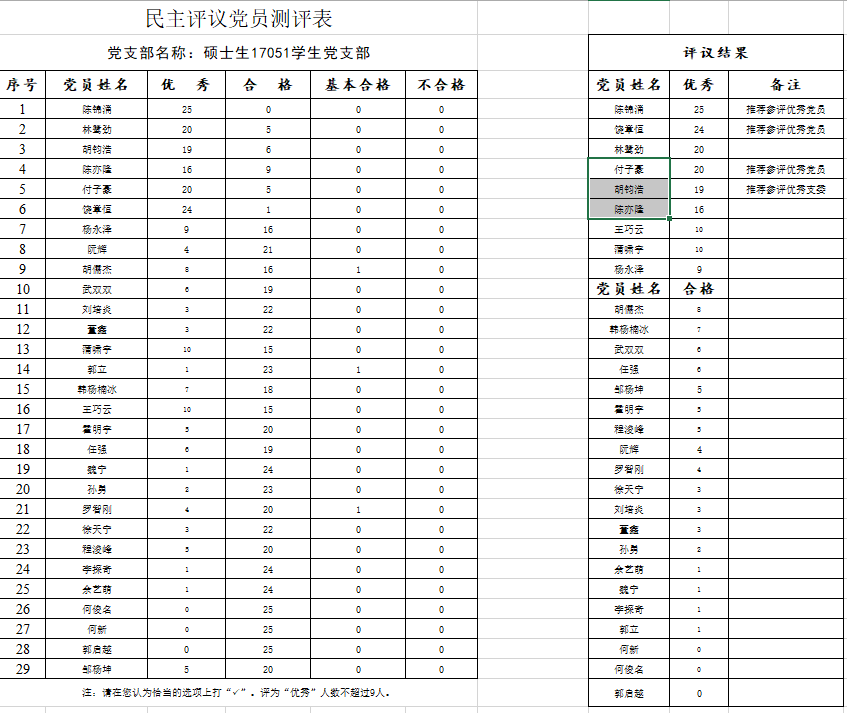 在所有同志发言结束后,会议进行到了民主评议环节。支部委员展示了2019年支部党员同志参与支部活动情况的统计。大家结合各位党员在参与支部活动和支部建设表现,根据自己对各位党员的认识作出公正合理的评价。民主测评按照“优秀”、“合格”、“基本合格”、“不合格”四种等次进行评定,评定为“优秀”的党员比例一般不超过三分之一。随后,与会党员进行投票,最终9位同志评定为“优秀“。支部中,宣传委员胡钧浩被推荐参评优秀支委,陈锦涌、饶章恒、付子豪三名同志被推荐参评优秀党员。