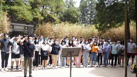 献花活动结束后,党支部同学面对党旗,宣读入党誓词。此次宣誓在烈士陵园中进行,不仅强化了个人的入党初心,也是在革命先烈的影响之下,进一步提升作为一名党员同志的使命意识。李大钊等先辈为了中国革命事业不断奋斗,方才换来我们现在繁荣稳定的生活;作为后辈的我们许下庄严誓言,表达着当代青年接续前进的决心。柏树森森,先烈长眠,同学们伫立良久,感触颇多。
