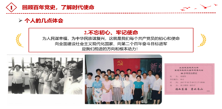 徐老师还分享了自己学习党史的两点体会。首先是“不忘过去,牢记历史”:学习党史,不仅是要总结历史经验,更是要从党史学习中激发信仰、获得启发、汲取力量,同时还要把党史学习落实到行动,自觉增强“四个意识”、坚定“四个自信”、做到“两个维护”。第二点是“不忘初心、牢记使命”,徐老师展示了自己入党宣誓时的珍贵历史照片,分享了自己的入党初心,勉励同学们:“你们正处于国家发展最好的时代,应该用行动践行初心使命,为全面建设社会主义现代化国家而奋斗。”