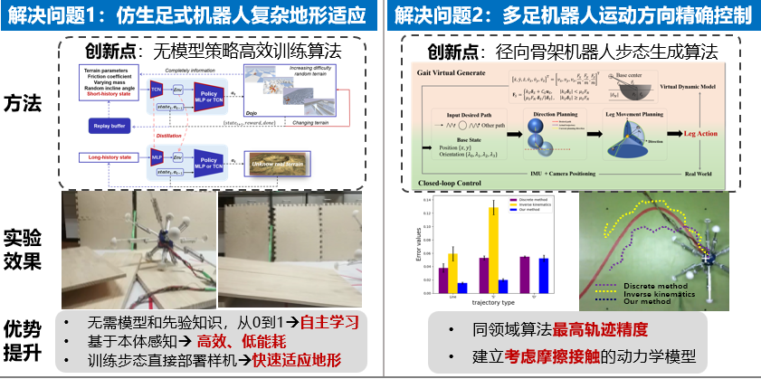 杨顿同学的研究方向是行星极端表面自主探测机器人。作为实验室机器人方向学生负责人,杨顿同学组建了“行星漫步者”团队,从零起步,自主设计实现多代地形适应机器人自主学习算法,攻克了多足仿生机器人高精度动力学建模、步态生成、智能控制等一系列关键技术。